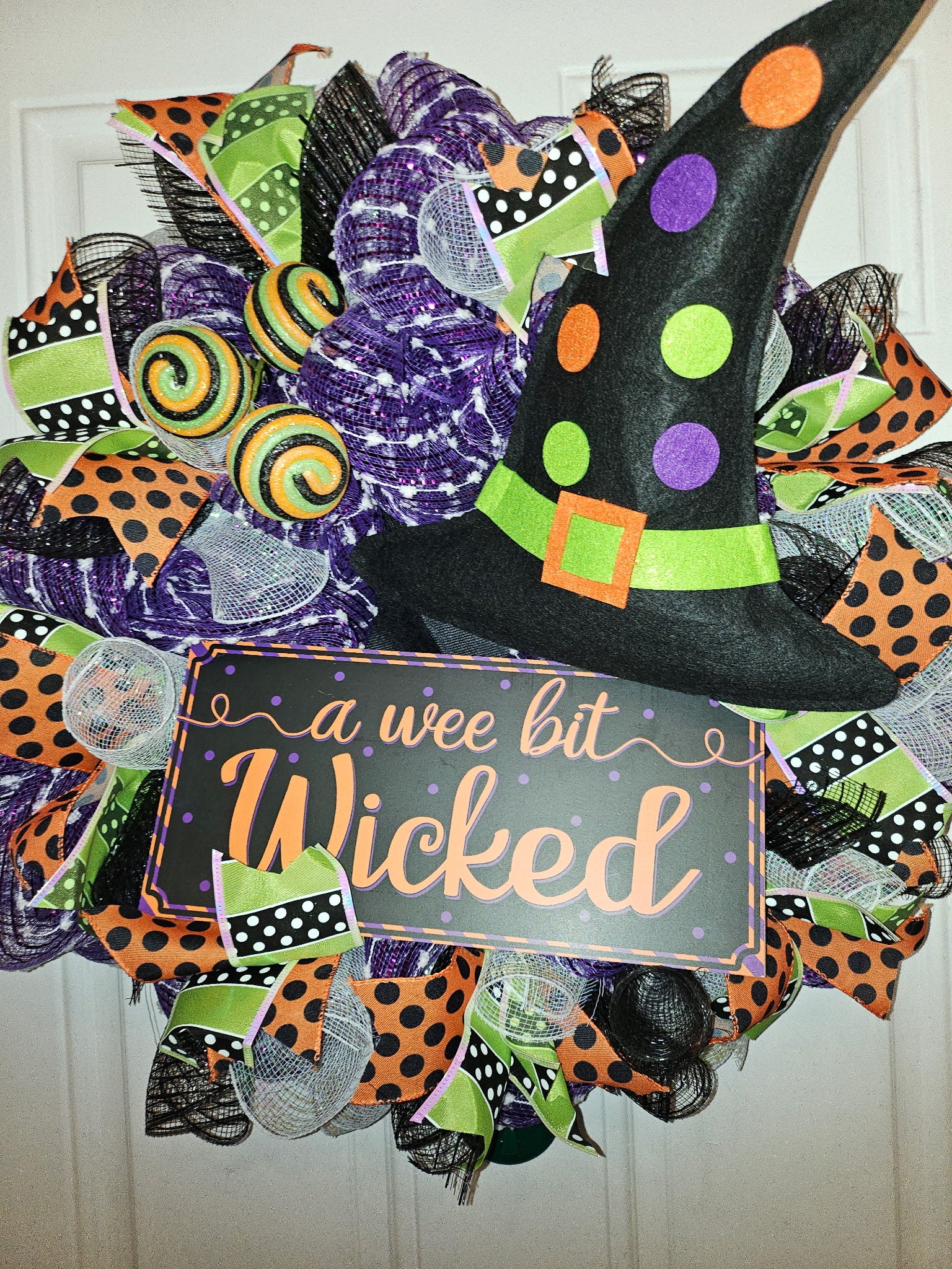 This whimsical Halloween wreath casts a playful spell with its large polka-dotted witch hat and sign that reads “a wee bit Wicked.” Featuring vibrant ribbons in green, orange, purple, and black, along with swirled lollipops and sparkly mesh, it’s the perfect door décor for anyone who celebrates the fun side of spooky season.