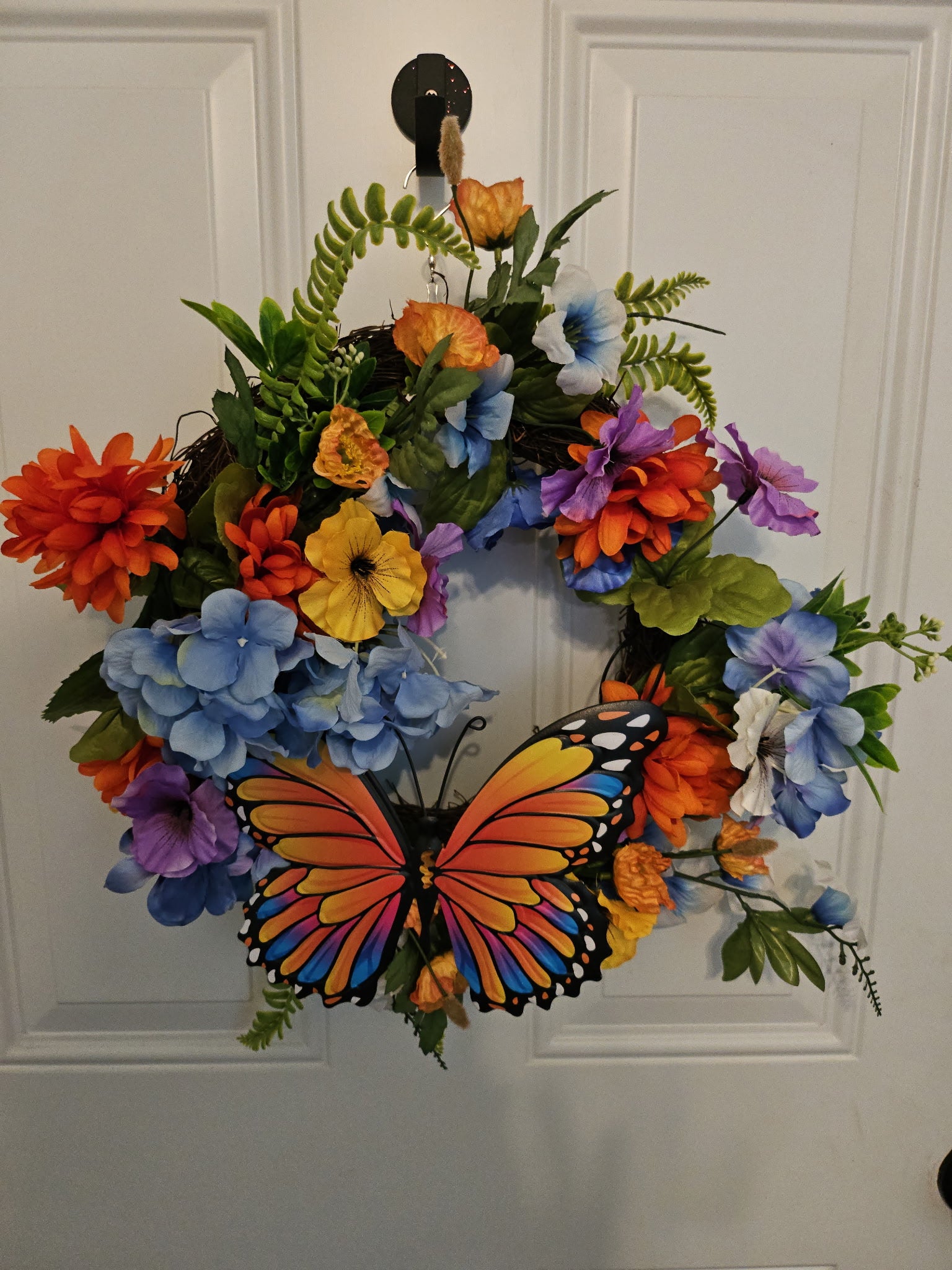 A lively and colorful wreath bursting with bright faux flowers in shades of orange, blue, purple, and yellow, accented with lush greenery. A large, eye-catching butterfly centerpiece adds a whimsical touch—perfect for spring or summer décor.