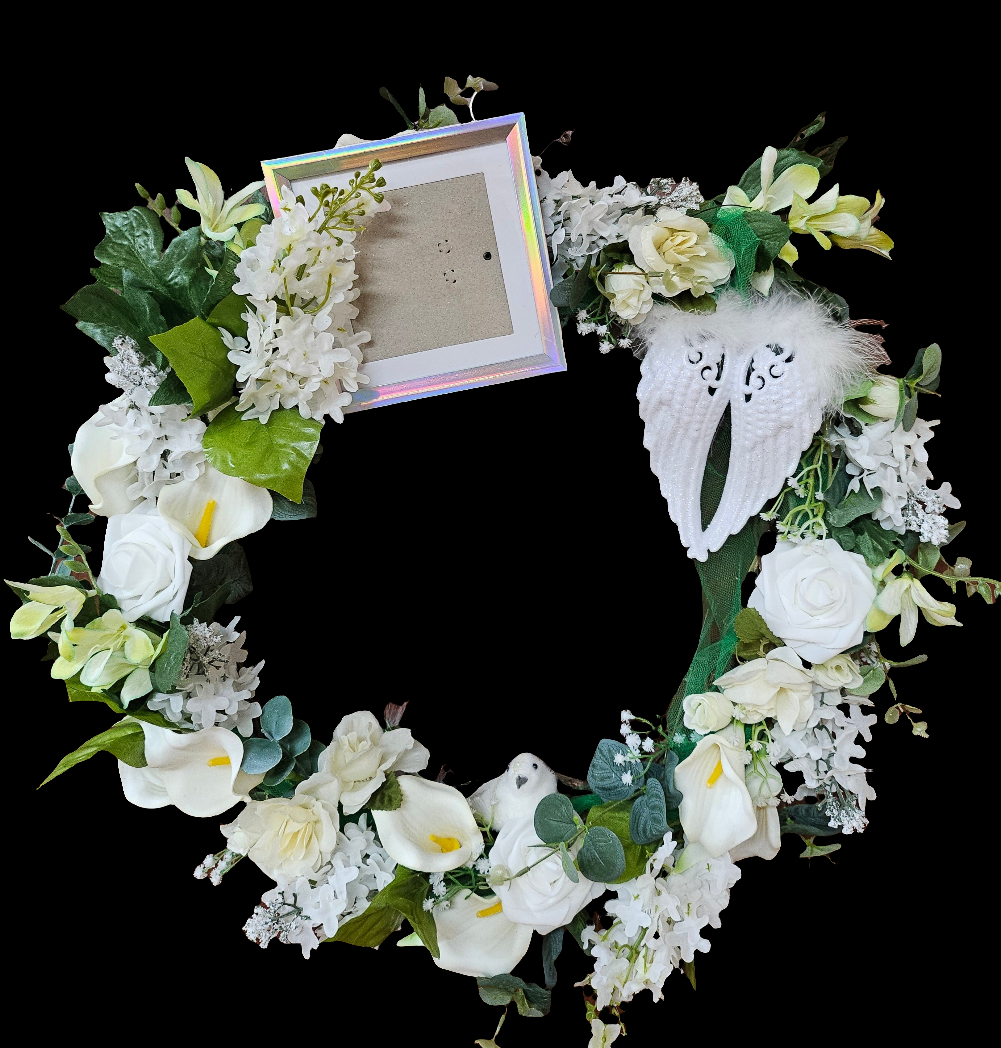 Customize this beautiful funeral wreath with angel wings and a picture frame to honor your loved one in their favorite color. A touching and personalized way to remember and celebrate their life. Choose a color that truly reflects their spirit and personality. A heartfelt way to honor their memory.