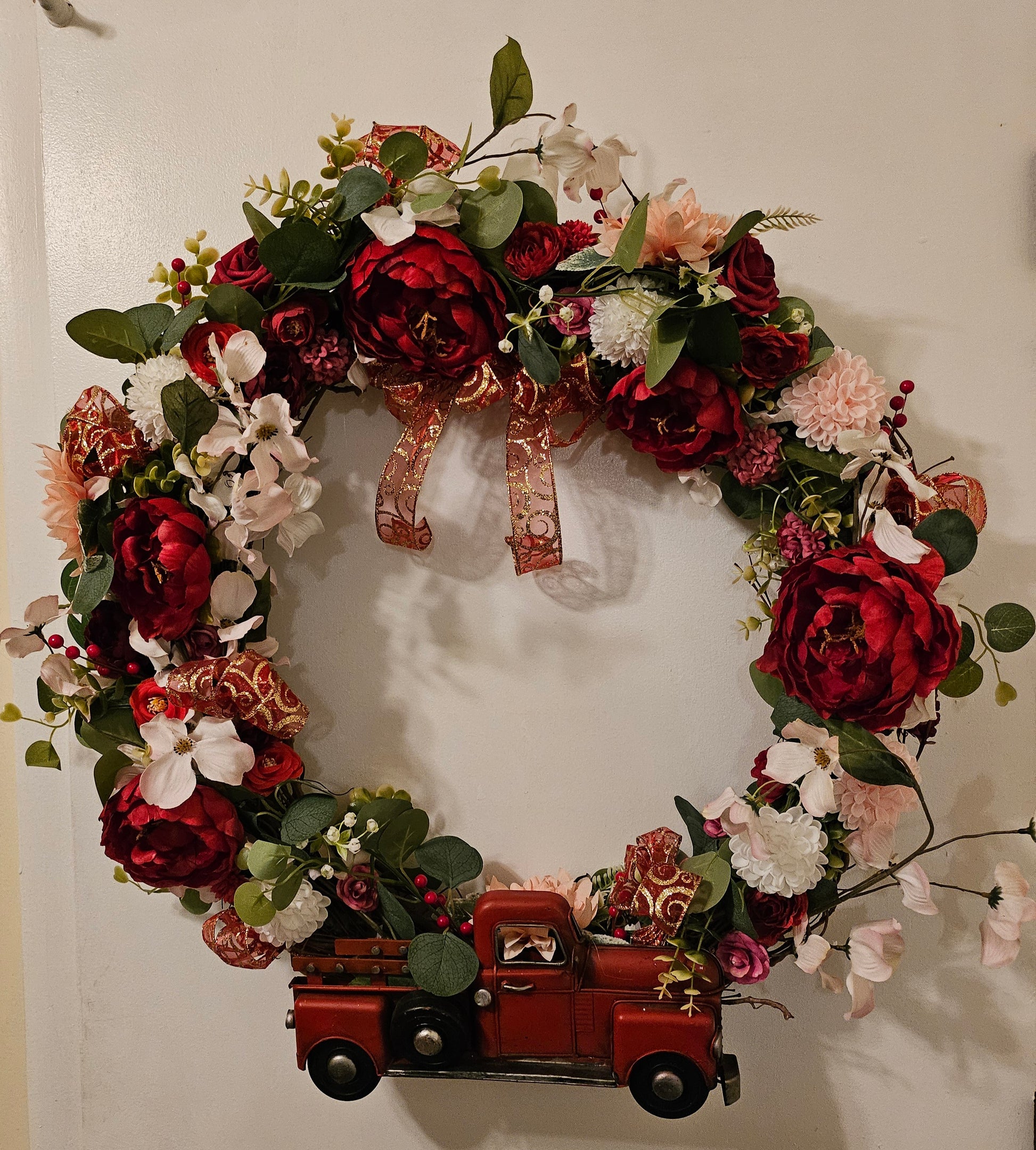 This extra large holiday wreath features a country truck design, perfect for adding festive charm to your home decor. Measuring in at an impressive size, it is sure to make a statement and be the focal point of any room. Bring the holiday spirit home with this beautiful grapevine wreath.