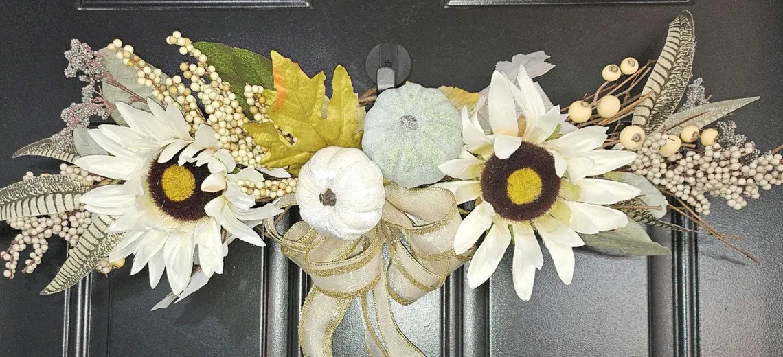 This elegant fall swag blends creamy white sunflowers, soft velvet pumpkins, and clusters of ivory berries with golden ribbon and muted greenery. A sophisticated take on autumn décor, perfect for neutral lovers or anyone looking to add a touch of refined charm to their front door or mantle.