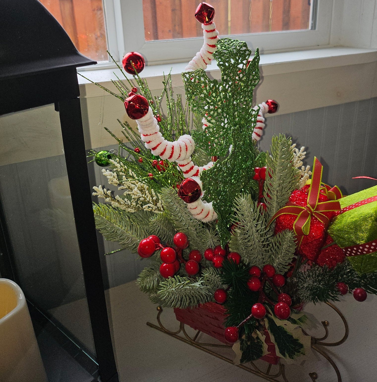 This charming Christmas arrangement features a red sleigh filled with holiday greenery, candy cane spirals, red berries, frosted accents, and glittery gift boxes topped with bows. A cheerful and eye-catching piece, it’s perfect for tabletops, mantels, or entryways to bring festive spirit into your home. Lantern not included.