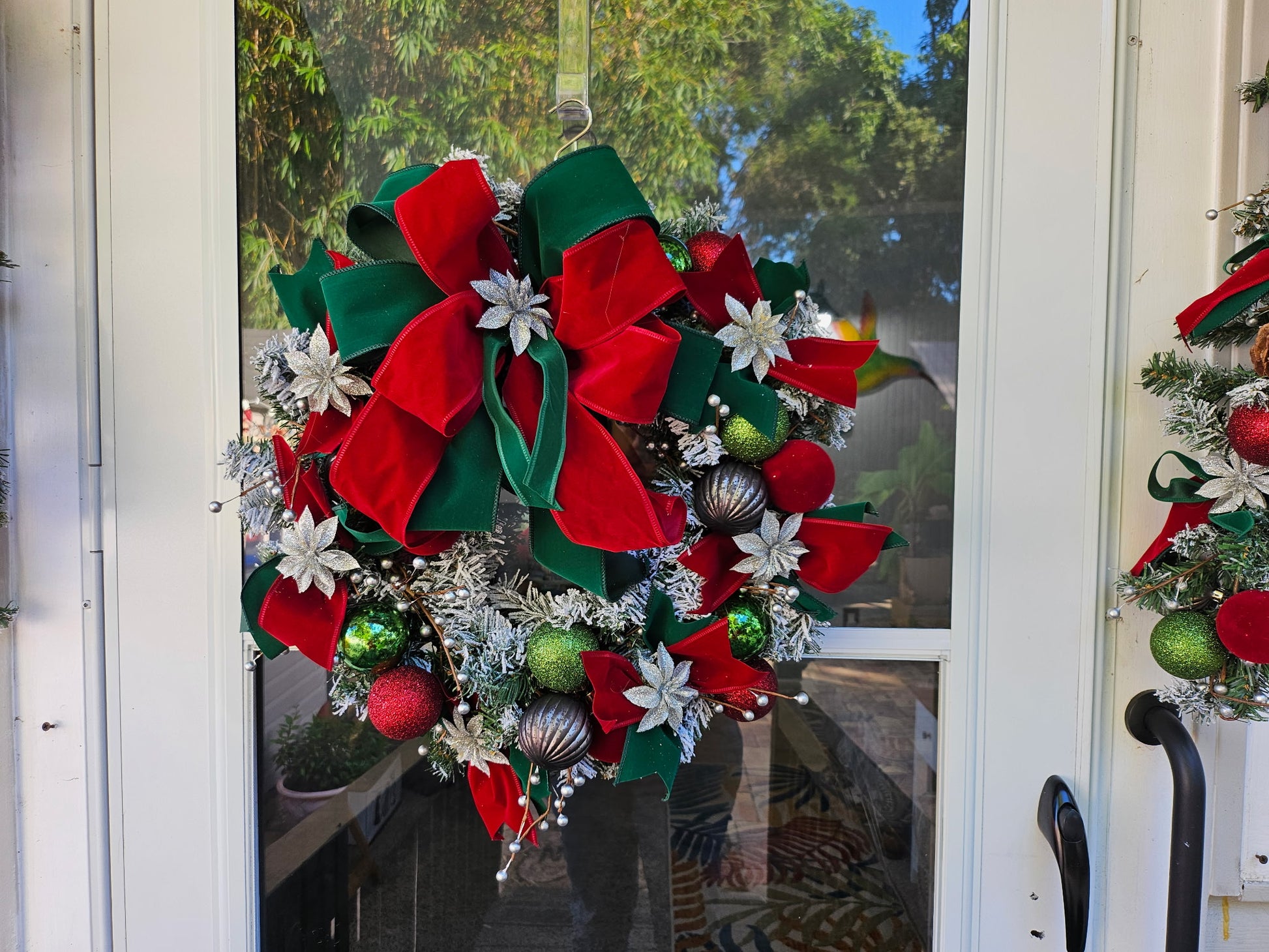 This classic Christmas wreath and 9.5-foot garland set brings timeless holiday charm to your doorway with rich red and green ribbons, sparkling silver accents, and festive ornaments. Pinecones and shimmering florals add a touch of natural elegance, creating a warm and welcoming entrance. Perfect for adding traditional Christmas spirit to your home’s exterior décor.