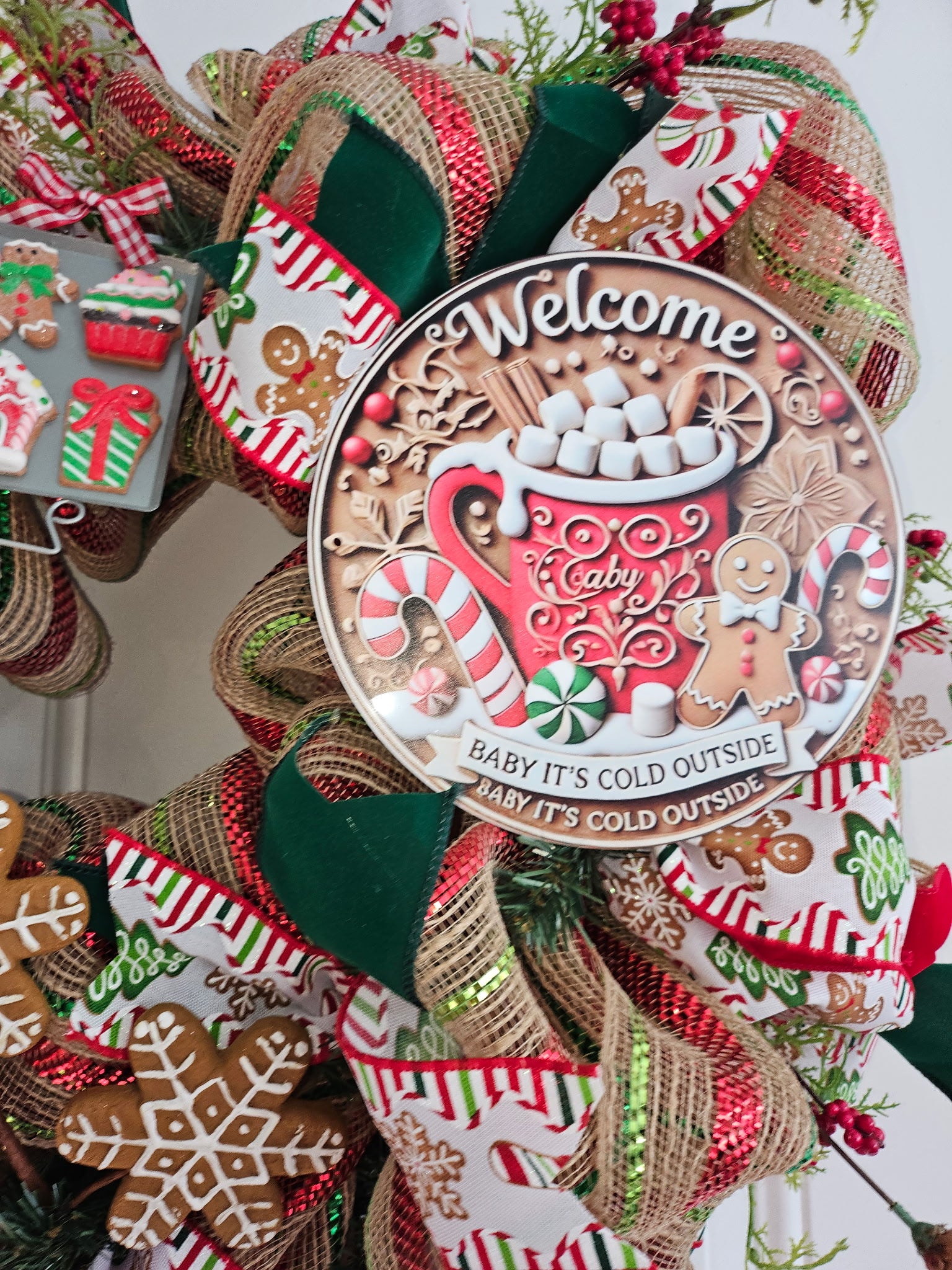 Sweeten up your holiday décor with this cheerful wreath featuring a plush gingerbread girl, candy cane ribbons, gingerbread cookies, and a welcoming hot cocoa sign. Perfect for spreading warm holiday cheer on your front door or inside your home.