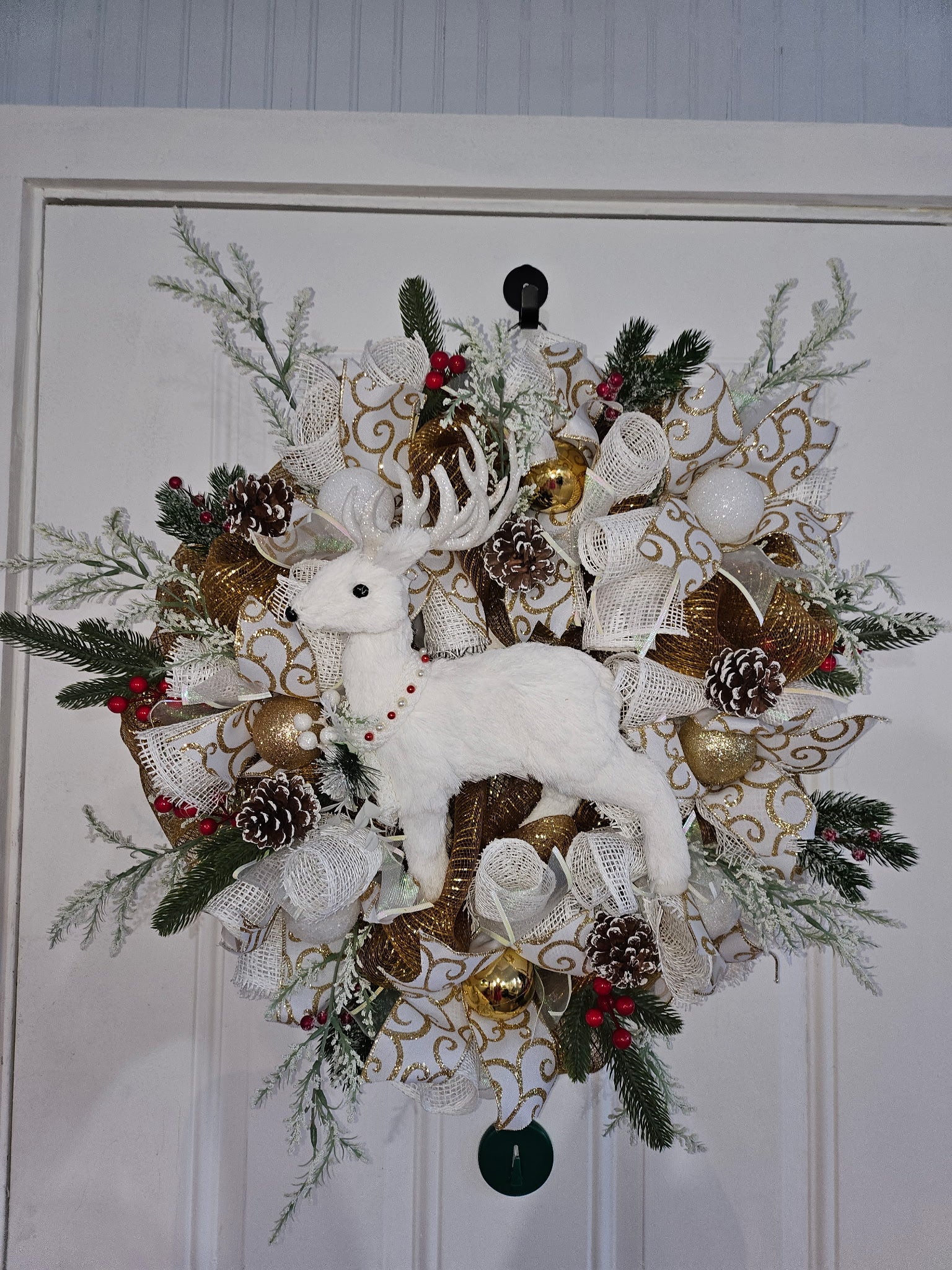 This festive holiday wreath features a white reindeer centerpiece surrounded by gold and white ribbons, glittering ornaments, faux pine branches and cones, red berries, and frosted greenery. Elegant and whimsical, it brings a touch of winter wonder to any door.