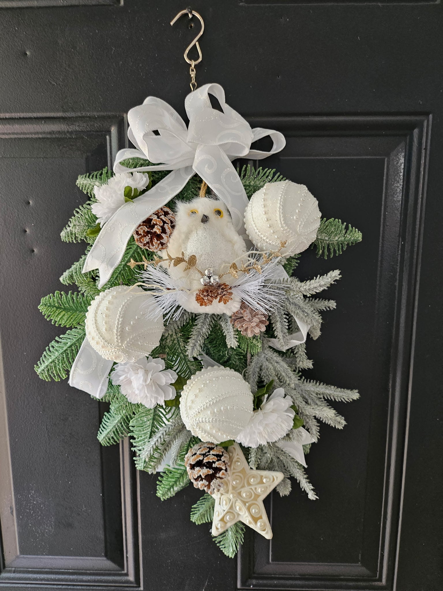 This elegant winter swag exudes a peaceful charm with its frosted greenery, white ornaments, and soft pinecones. A fluffy white owl sits at the center, surrounded by a shimmering bow and delicate floral accents. Perfect for adding a cozy woodland touch to your holiday décor.