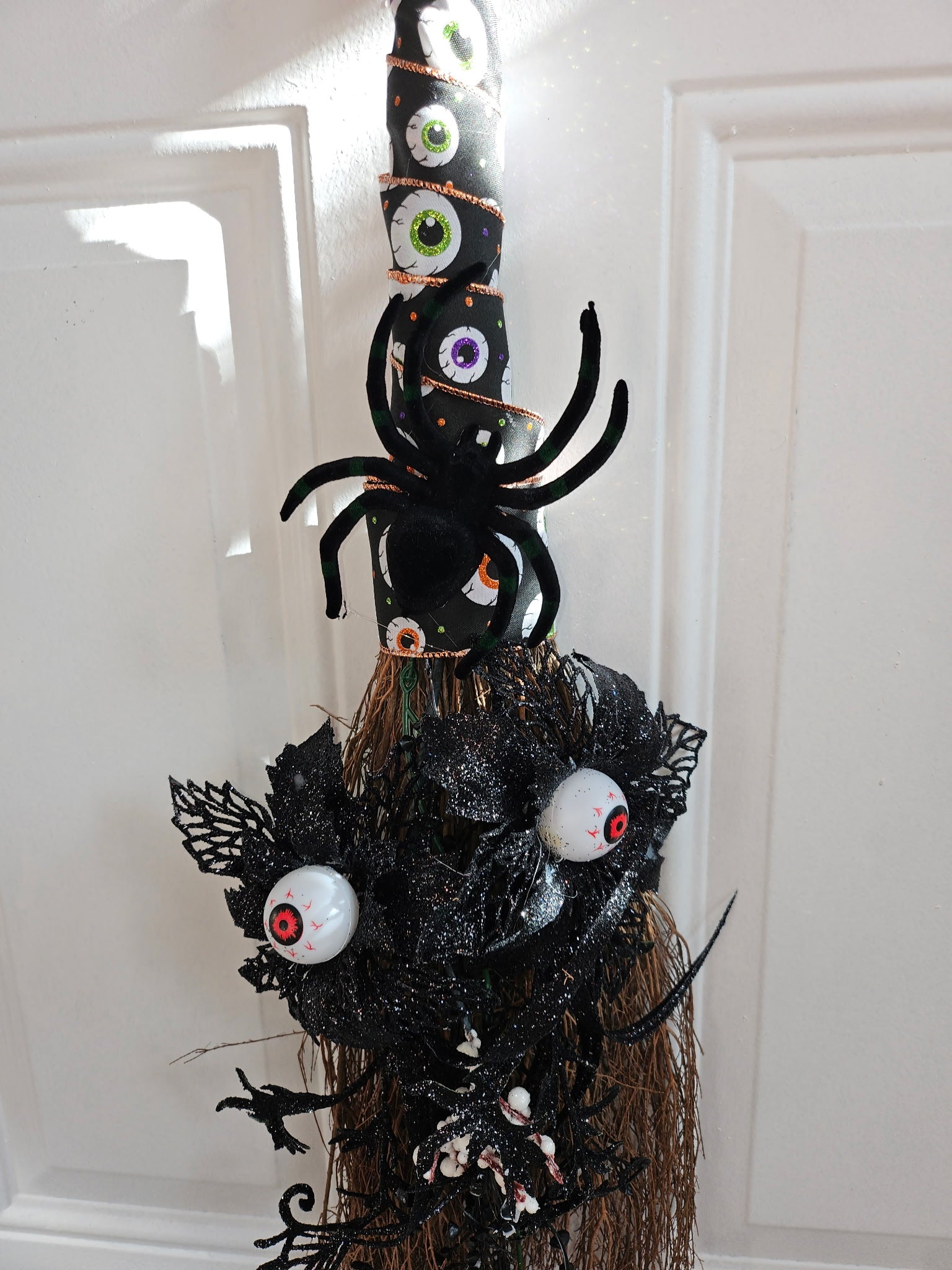 Bring eerie vibes to your Halloween décor with this hanging witch broom, wrapped in eyeball ribbon and topped with creepy black spiders. The broom bristles are decorated with haunting black accents and glaring eyeballs, making it a chilling addition to any door, wall, or porch display.