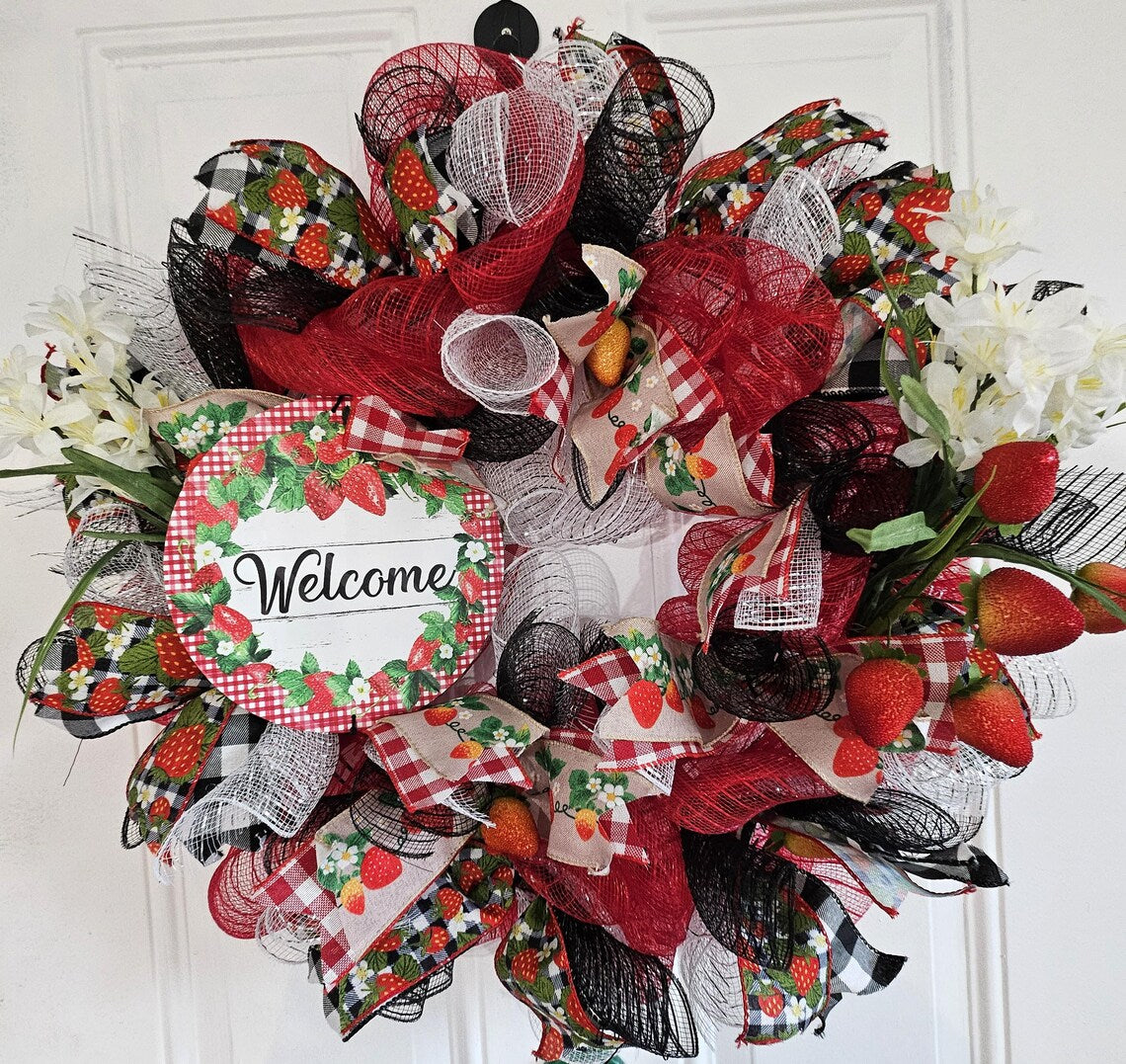 A vibrant strawberry-themed wreath bursting with red, black, and white mesh, gingham ribbons, faux strawberries, and white florals. A charming 'Welcome' sign surrounded by berry accents makes this the perfect cheerful touch for summer décor.