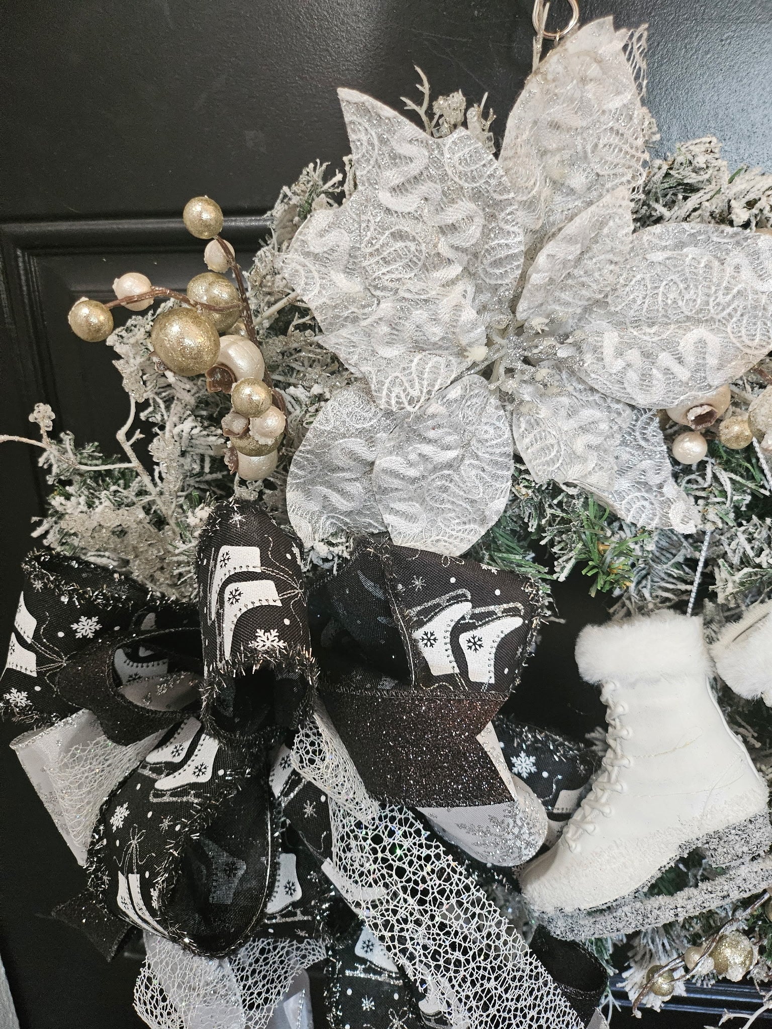 Elegant winter wreath featuring frosted greenery, shimmering silver poinsettias, glittering ornaments, and a pair of white ice skates accented with festive black and silver ribbon, perfect for holiday décor with a cozy skating theme.